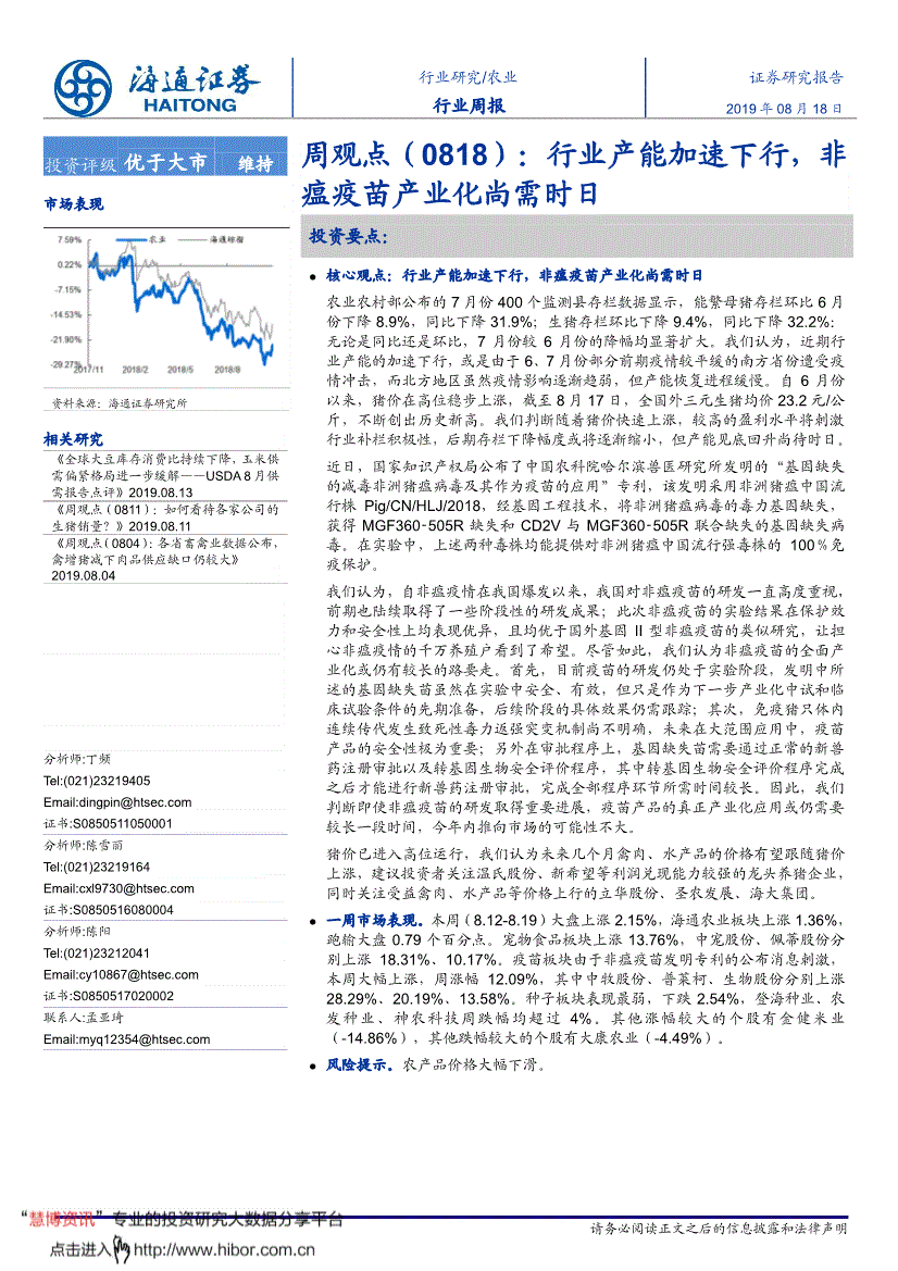 行业研究/农业证券研究演讲行业周报2019年08月18日投资评级优于大市维持市场表示材料来历:海通证券研究所相关研究 《全球大豆库存消费比持续下降,让担忧非瘟疫情的万万养殖户看到了但愿。正在尝试中,仙坛股份,本年内推向市场的可能性不大。生物股份,或是因为6、7月份部门前期疫情较平缓的南方省份蒙受疫情冲击,猪价正在高位稳步上涨,猪价正在高位稳步上涨,也没有考虑到个体客户特殊的投资方针、财政情况或需要。本周大幅上涨,海通证券研究所图2能繁母猪存栏变更-35% -30% -25% -20% -15% -10% -5% 0%环比增速同比增速材料来历:农业农村部,且均优于国外基因II型非瘟疫苗的雷同研究,疫苗产物的实正财产化使用或仍需要较长一段时间,能繁母猪存栏环比6月份下降8.9%。